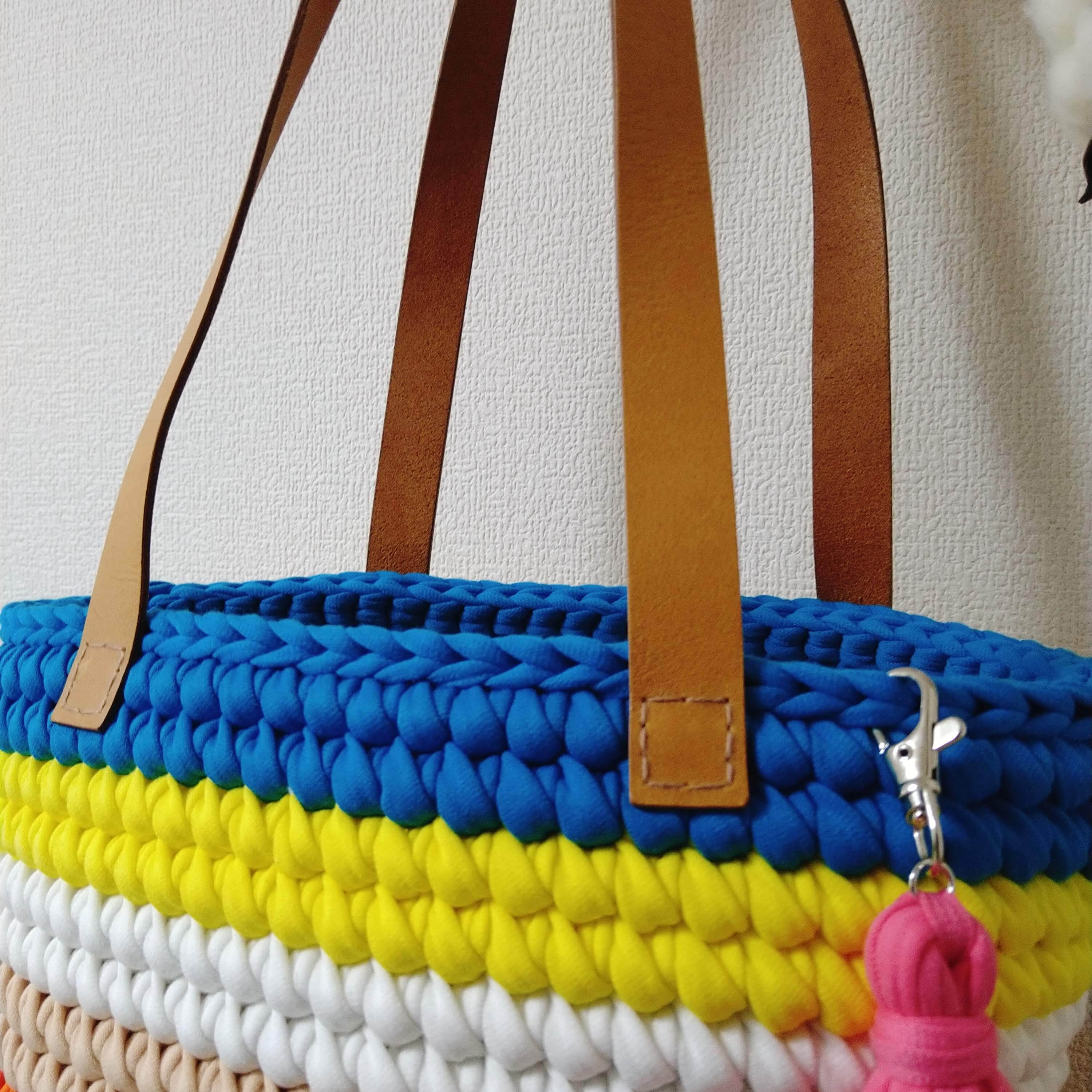 何色ものカラフルな色が入った円底のマルシェバッグ